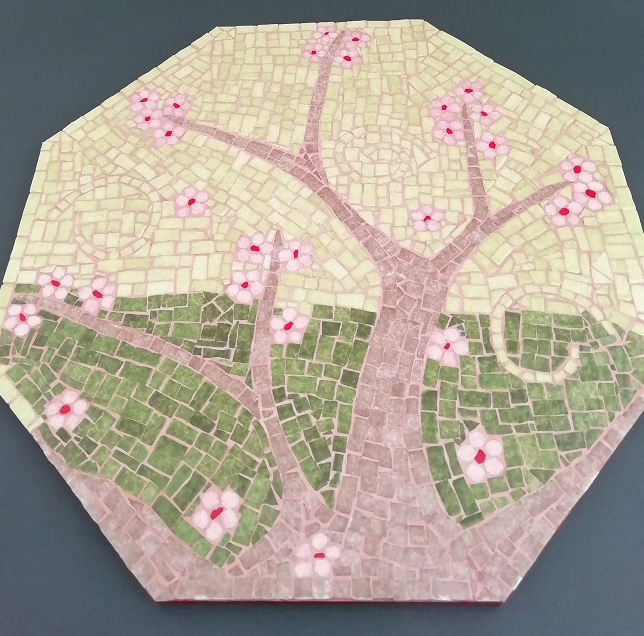 Support en bois octogonal décoré avec des émaux de Briare pour le dessus et peint à l'acrylique sur le reste de la surface.